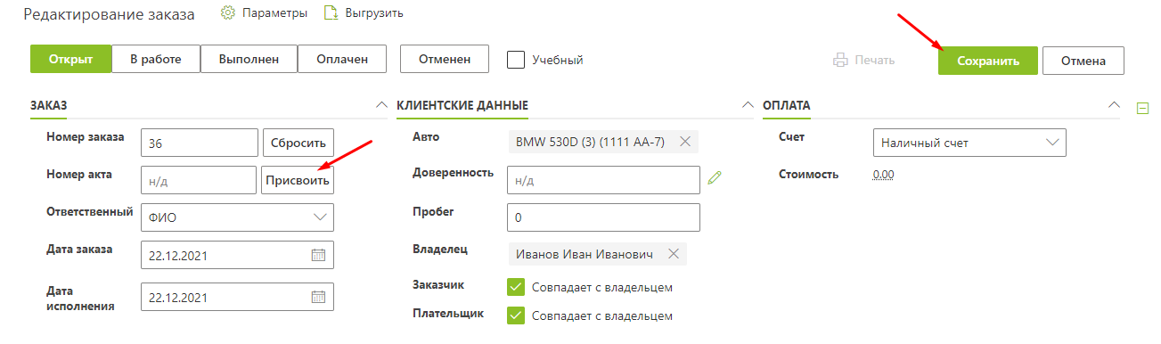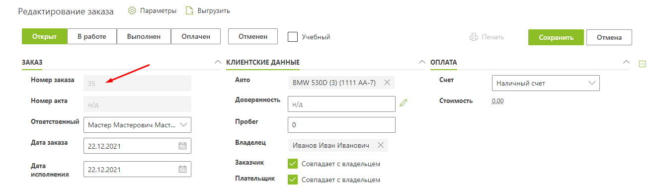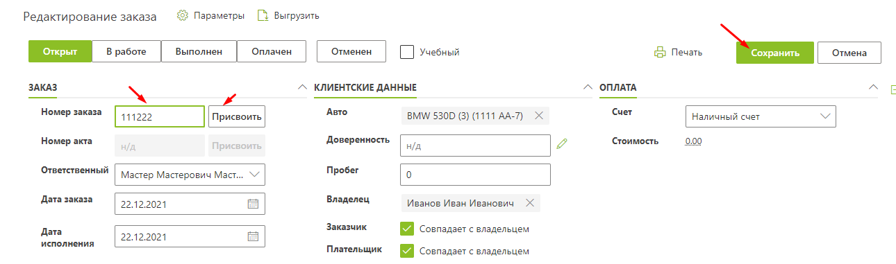 Присвоить номера документу можно вручную и автоматически. При автоматическом присвоении заказ получает номер автоматически после сохранения. Данный номер заказ вы не сможете отредактировать.
