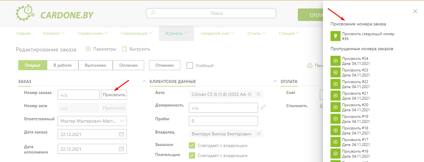 то после сохранения заказа и нажатия Присвоить вам будет предложен список доступных номеров заказа.