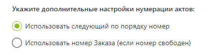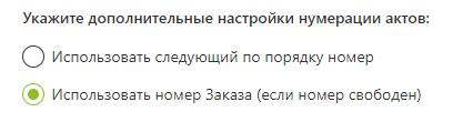 Для нумерации актов есть 2 опции: Использовать следующий по порядку номер или Использовать номер заказа.
