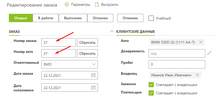 после сохранения заказа и нажатия Присвоить номер акта будет таким же как и в заказе (при условии, что номер свободен) .