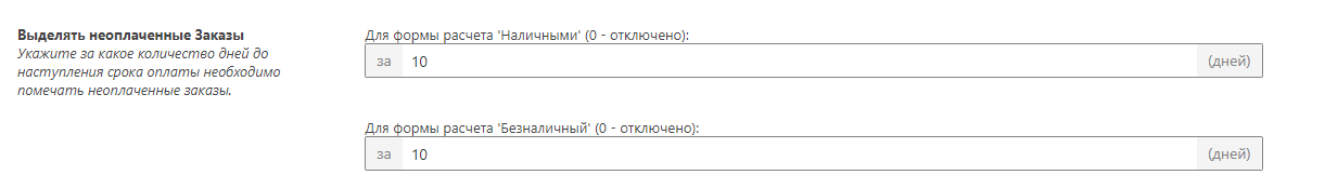 Если вы хотите, чтобы все выполненные неоплаченные заказы помечались за несколько дней до срока оплаты, то укажите количество дней для поля Выделять неоплаченные заказы.