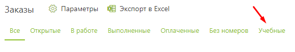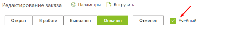 Чтобы создать учебный заказ, вам нужно создать заказ, а затем поставить галочку возле Учебный и сохранить изменения.