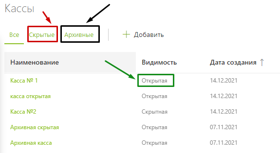 - Если хотите, чтобы касса была открытой, поставьте галочку в поле Видимость