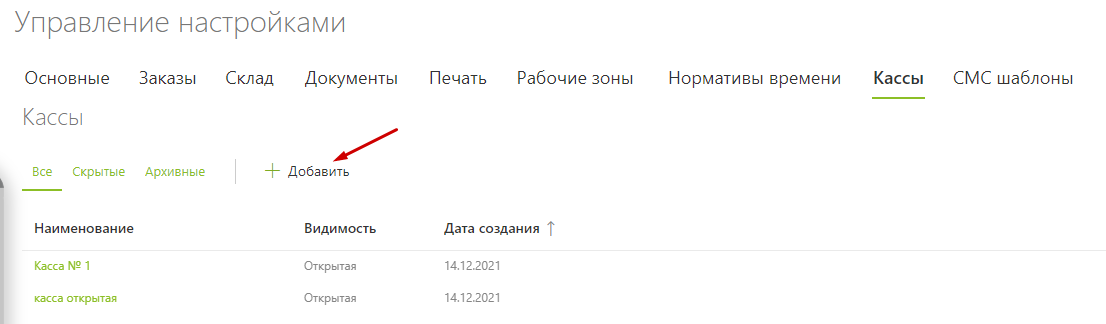 Эта активность предназначена для создания и редактирования касс. На листе со всеми кассами представлена информация о каждой из них: наименование кассы, видимость и дата создания.