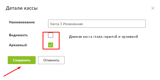 - Если вы хотите сделать кассу архивной, установите галочку в поле Архивная. В противном случае она будет обычной, неархивной кассой