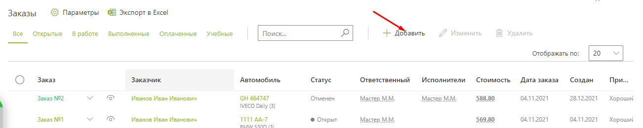 - Из Журналы -> Журнал заказов – перейдите в раздел "Журнал заказов" и нажмите Добавить на соответствующей странице