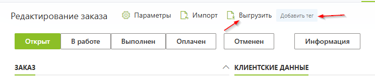 После того как заказ создан и сохранен вы можене воспользоваться следующими функциями: