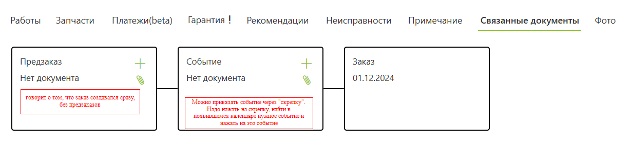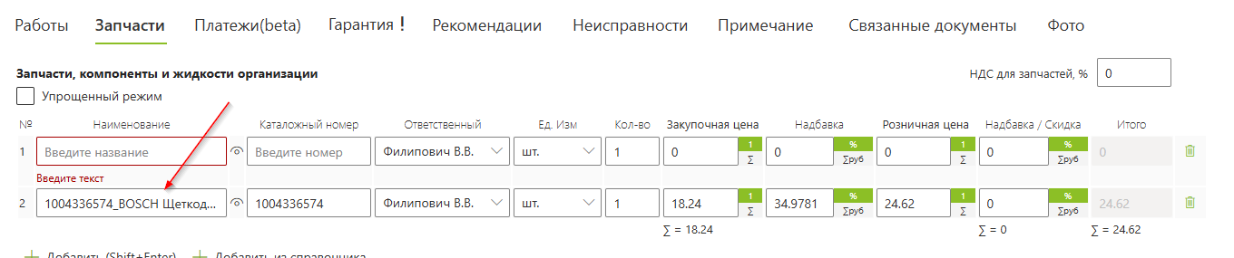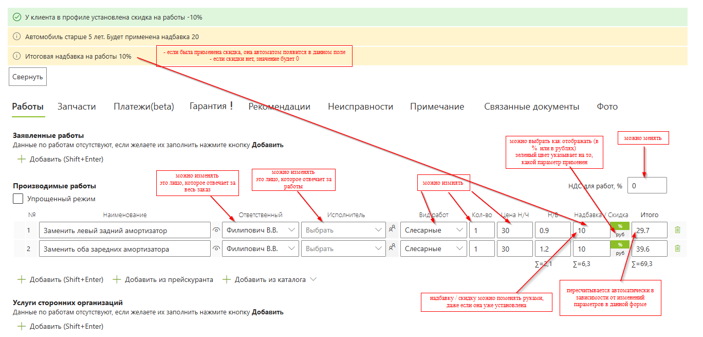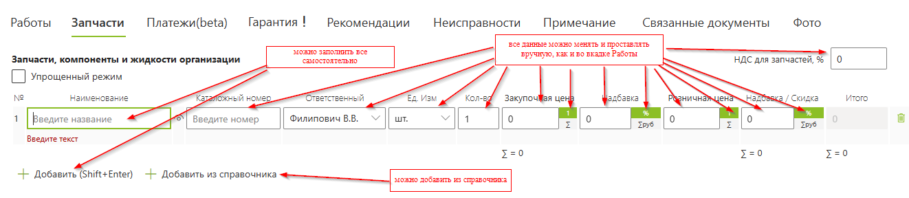 - Запчасти – укажите запчасти, предоставленные СТО или заказчиком