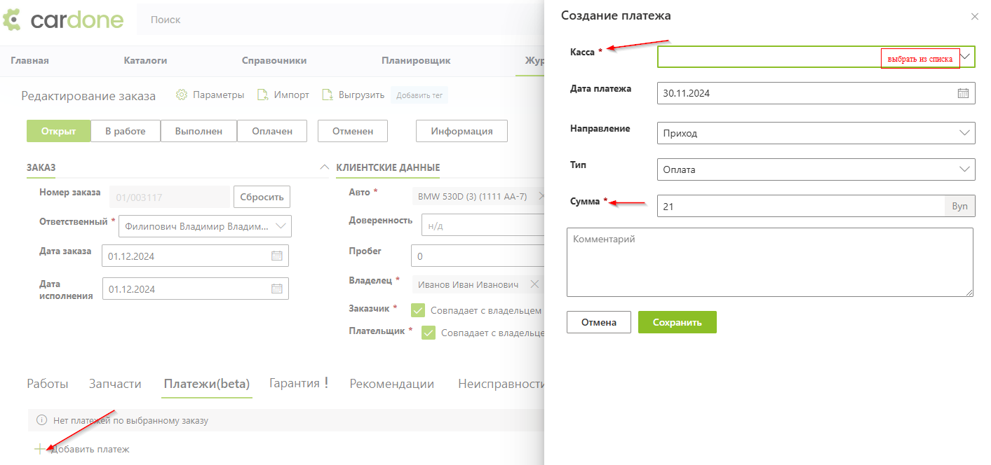 - В появившейся форме выбрать существующего клиента (этот клиент станет привязанным к данному автомобилю как владелец) или нажать "+Добавить" для создания нового клиента (если его нет в базе)