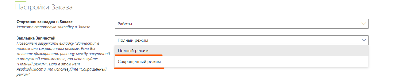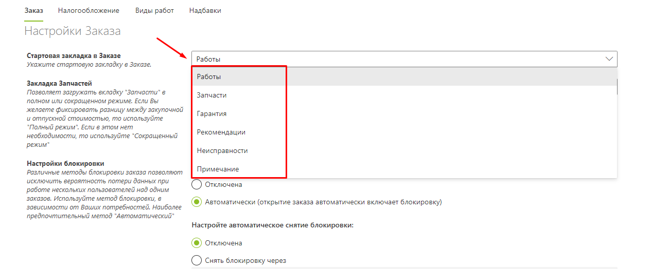 Настройка параметров взаимодействия с заказами, включая выбор стартовой закладки, режим отображения запчастей, настройки блокировки заказа и валидации пробега.Налогообложение: