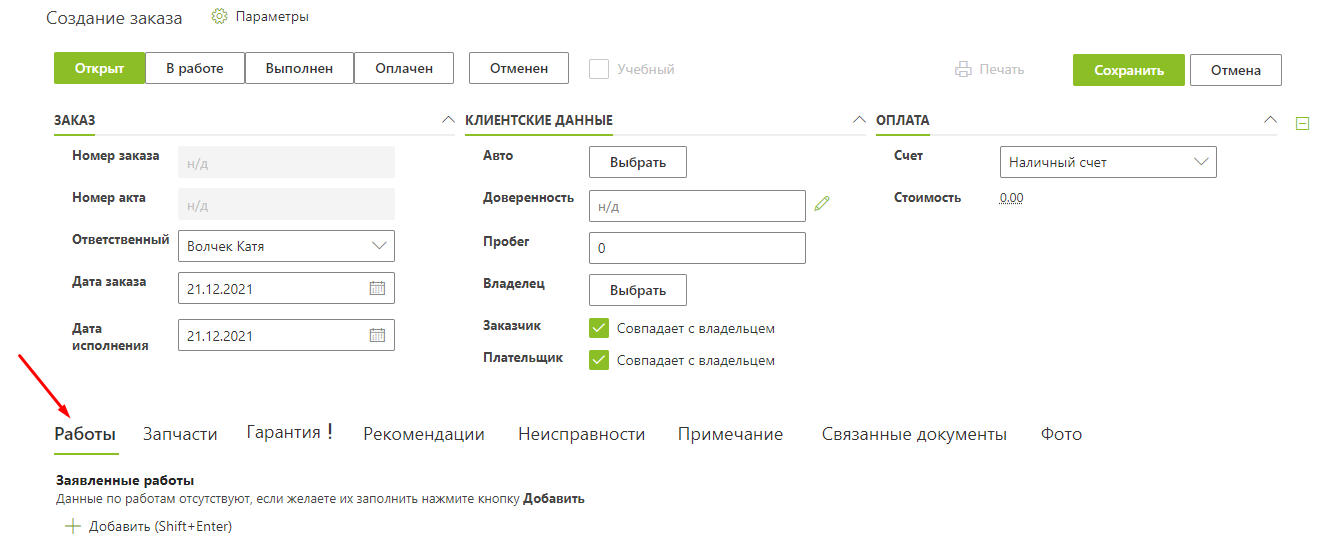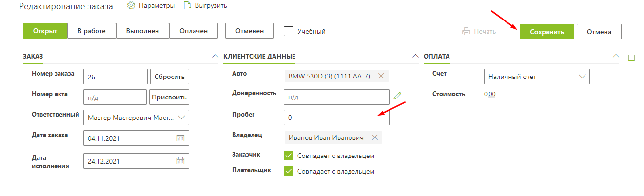 При включенной опции "Валидация пробега" необходимо указать пробег автомобиля при сохранении заказа. Если пробег не будет указан, заказ не сохранится.