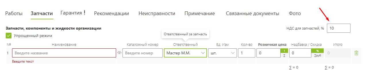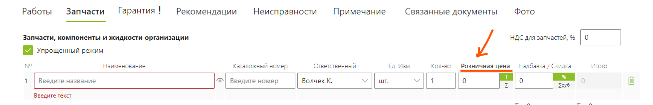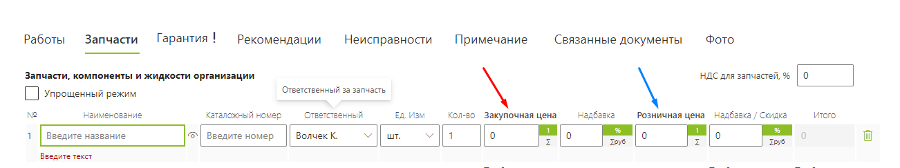 - Для надбавки на запчасти: закупочную стоимость и процент надбавки