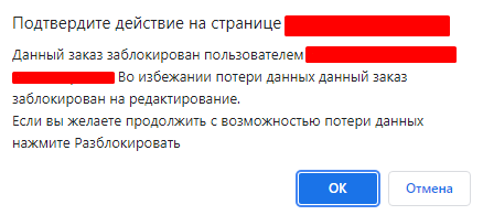 - По умолчанию блокирока всегда включена, т.к. править заказ одновременнно могут несколько пользователей. Если заказ находится в режиме редактирования, все остальные пользователи, пытающийся отредактировать заказ, увидят сообщение, что заказ заблокирован для редактирования.