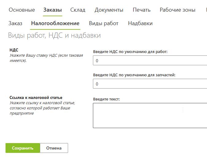 Установите или измените параметры налогообложения, применяемые к заказам. Вы можете выбрать типы налогов, указать ставки и задать правила их применения.Виды работ:
