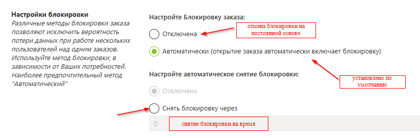 - Если блокировка заказа вам не нужна, эту опцию можно отключить через Настройте Блокировку заказа - Отключена, но в этом случае есть риск потери данных при одновременном редактировании заказа двумя пользователями.