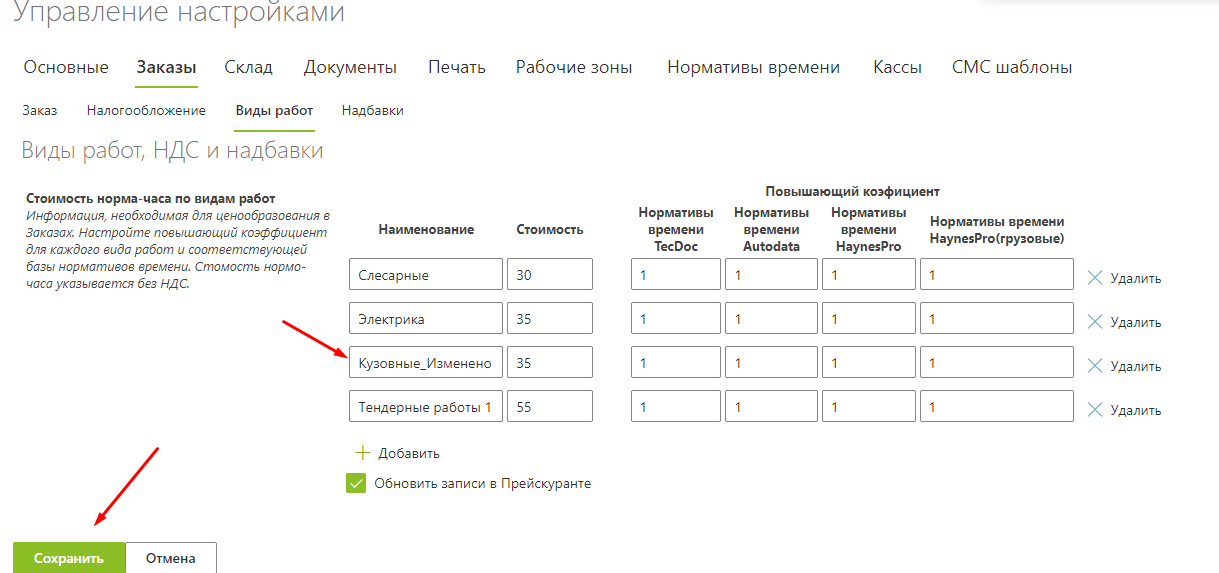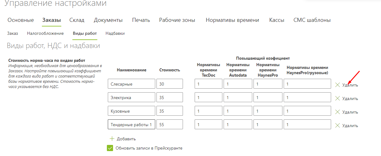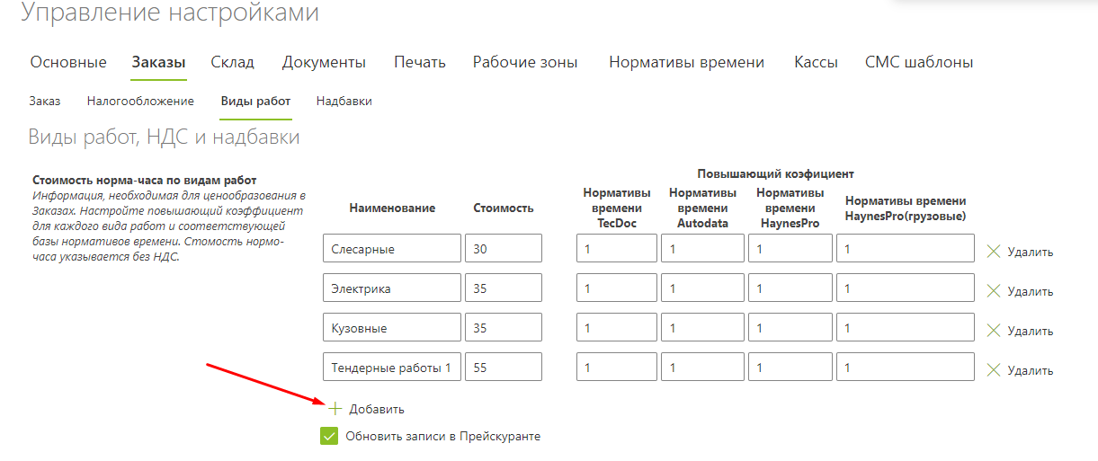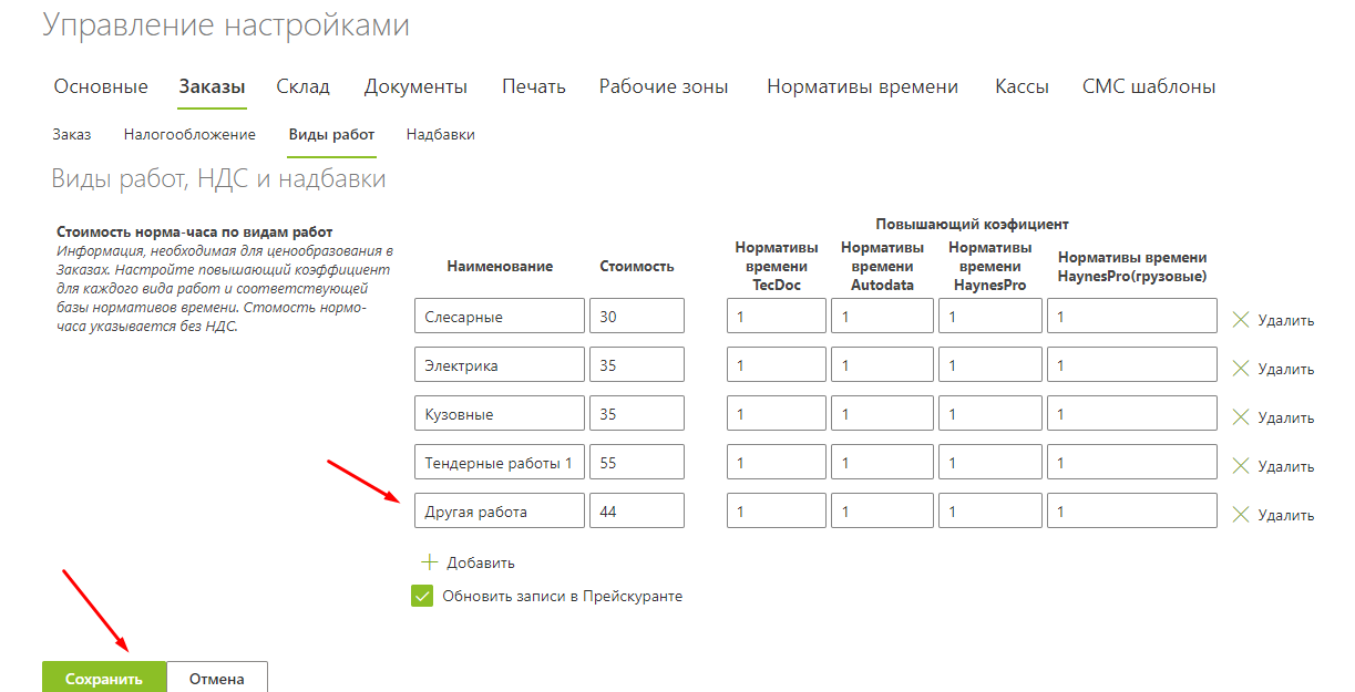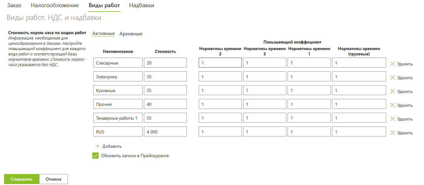 Управляйте перечнем видов работ, доступных для добавления в заказ. Добавляйте, изменяйте или удаляйте категории и типы работ, чтобы адаптировать список под специфику вашей деятельности.Надбавки: