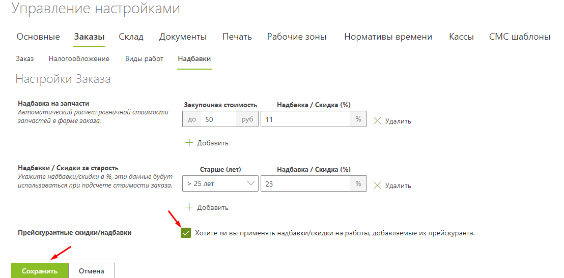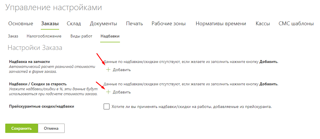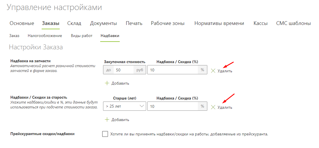 Настройка и управление системой надбавок и скидок. Вы можете задать фиксированные или процентные значения для надбавок, которые будут автоматически применяться к работам или запчастям в заказе.