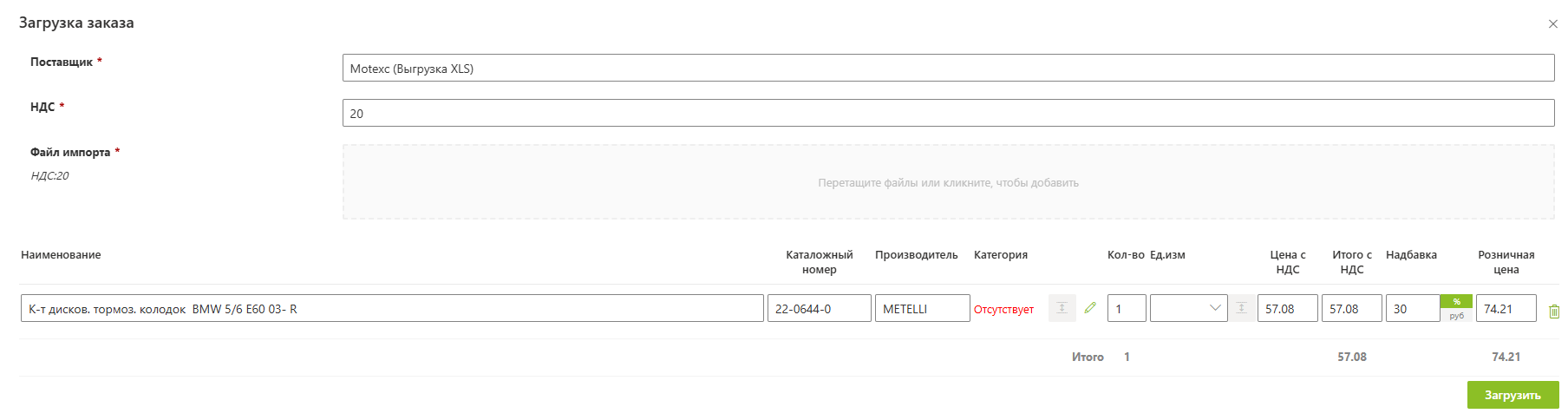 Выбирает в меню Поставщик - Motexc XLS - Выгрузка заказа и выбираем файл который скачали или просто переносим его.